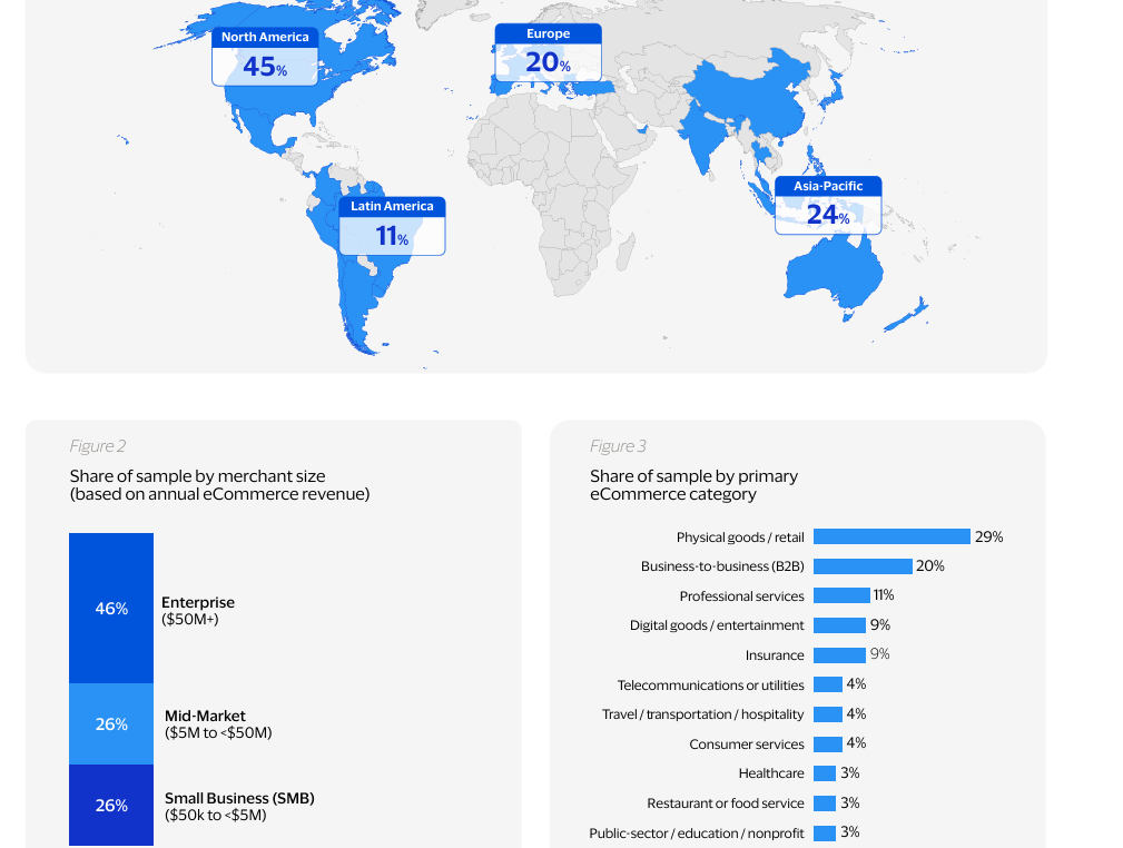 - Basado en una encuesta global a más de 1,000 comerciantes online de distintos tamaños (pequeñas empresas, medianas y grandes corporaciones).